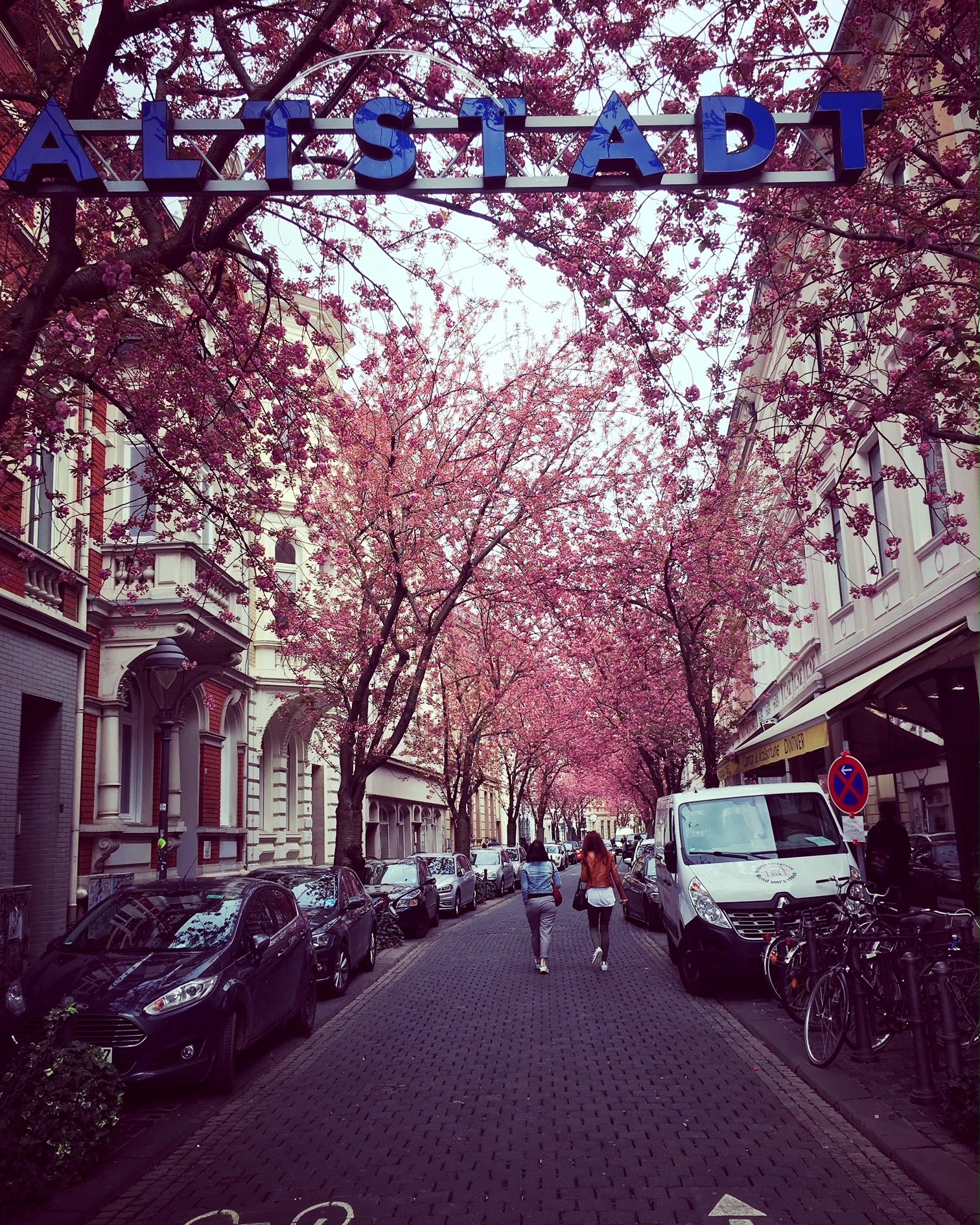 When I first moved to Germany we lived in Bonn. In the Altstadt there is a wonderful street, it was my favourite place to go and get a coffee and a croissant (which is for me one of the greatest pleasures in life!) from "Frau Holler Cafe" The street is filled with ornamental cherry trees and beautiful old buildings and has a funky alternative feel. of course the very best time to see this street is during the blooming of the cherry trees. It changes during this time and becomes a tourist trap. I was struck at the time how invigorating nature is for people.