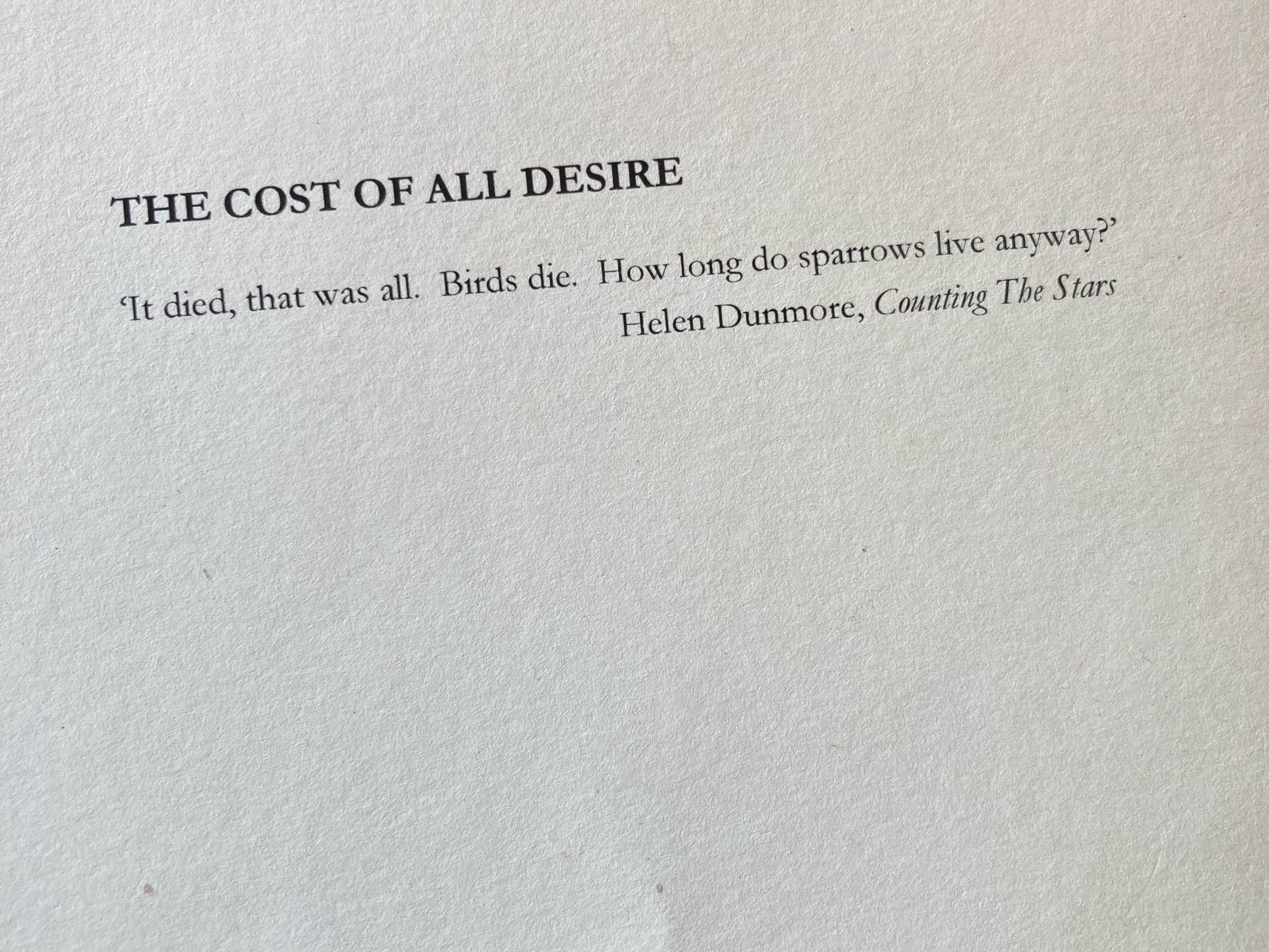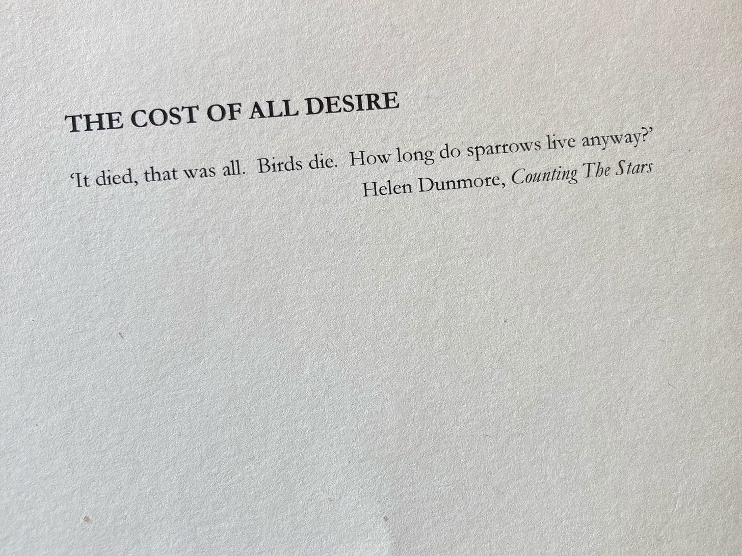 Needless to say it was one of the oddest things! I wrote to Jeremy Page to tell him about the weird occurrence and he was equally baffled! the book was one of his titled “The Cost of all Desire”. I keep wondering why did that bird fly into my letter box, what was it looking for? was it trying to escape from a predator or searching for a place to roost? I try not to think about its final hours unable to get out from a tiny space heating up in the sun. I try to honour its dying, its bizarre underlining of the Helen Dunmore quote - the message its dying seemed to have for me, unhappy in my hilltop house in the forest all alone - we moved away not long after.
